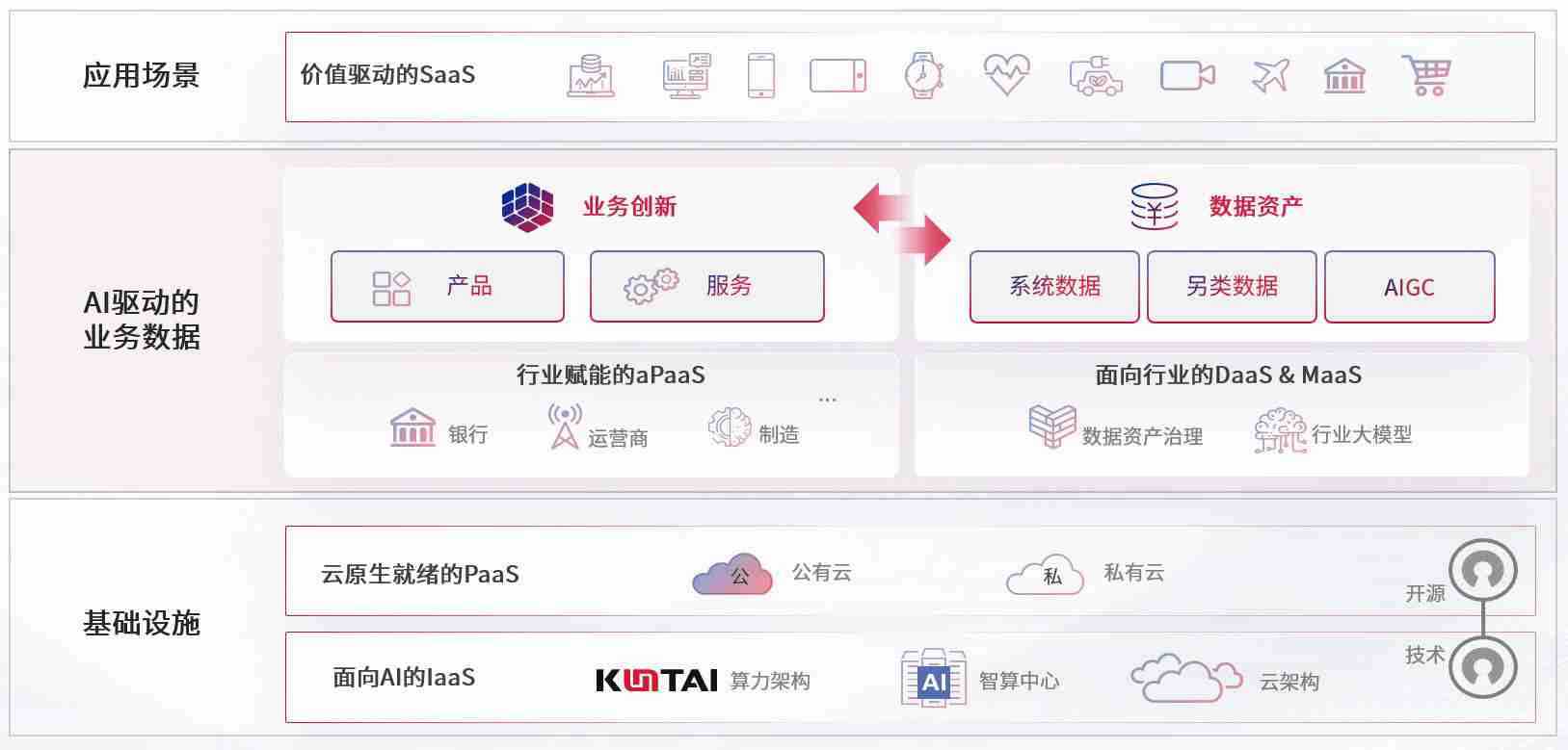 数字时代,,,围绕企业数字化转型的关键要素,,,AG尊龙凯时数码开创性的提出数云融合战略和技术体系框架,,,着力在云原生、、、数字原生、、、、AI原生和信创产业上架构产品和服务能力,,为处在不同数字化转型阶段的快消零售、、、、汽车、、、、金融、、、医疗、、政企、、教育、、运营商等行业客户提供泛在的敏捷IT能力和融合的数据驱动能力,,,,构建跨界融合创新的数字业务场景和新业务模式,,助力企业级客户建立面向未来的核心能力和竞争优势,,,全面推动社会的数字化、、、、智能化转型升级。。。。